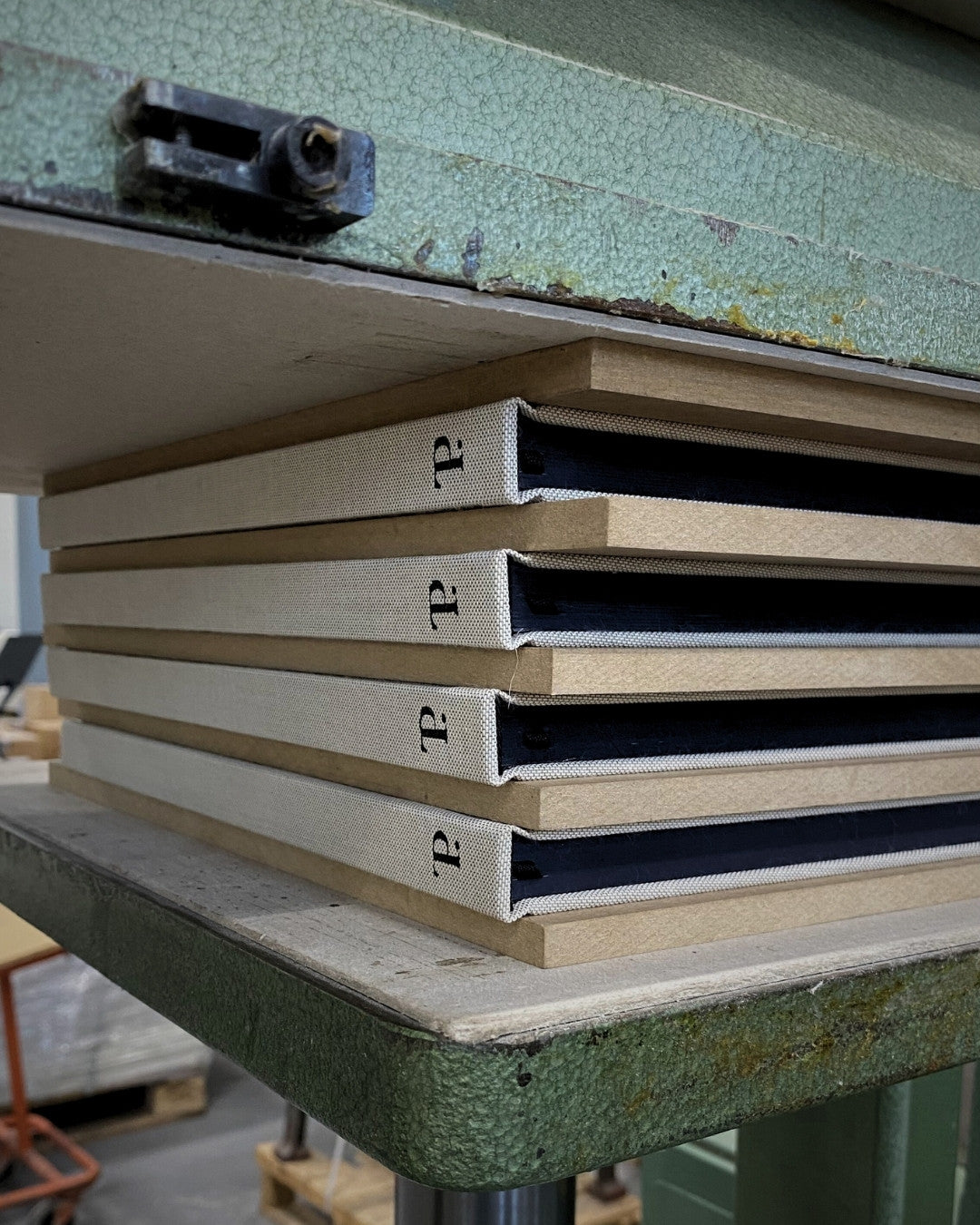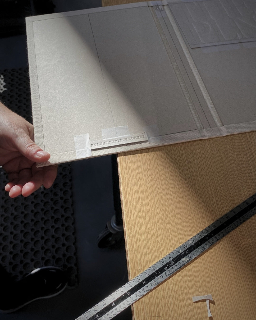 The matte-black deboss on linen may arrive with patina. It's not a flaw.